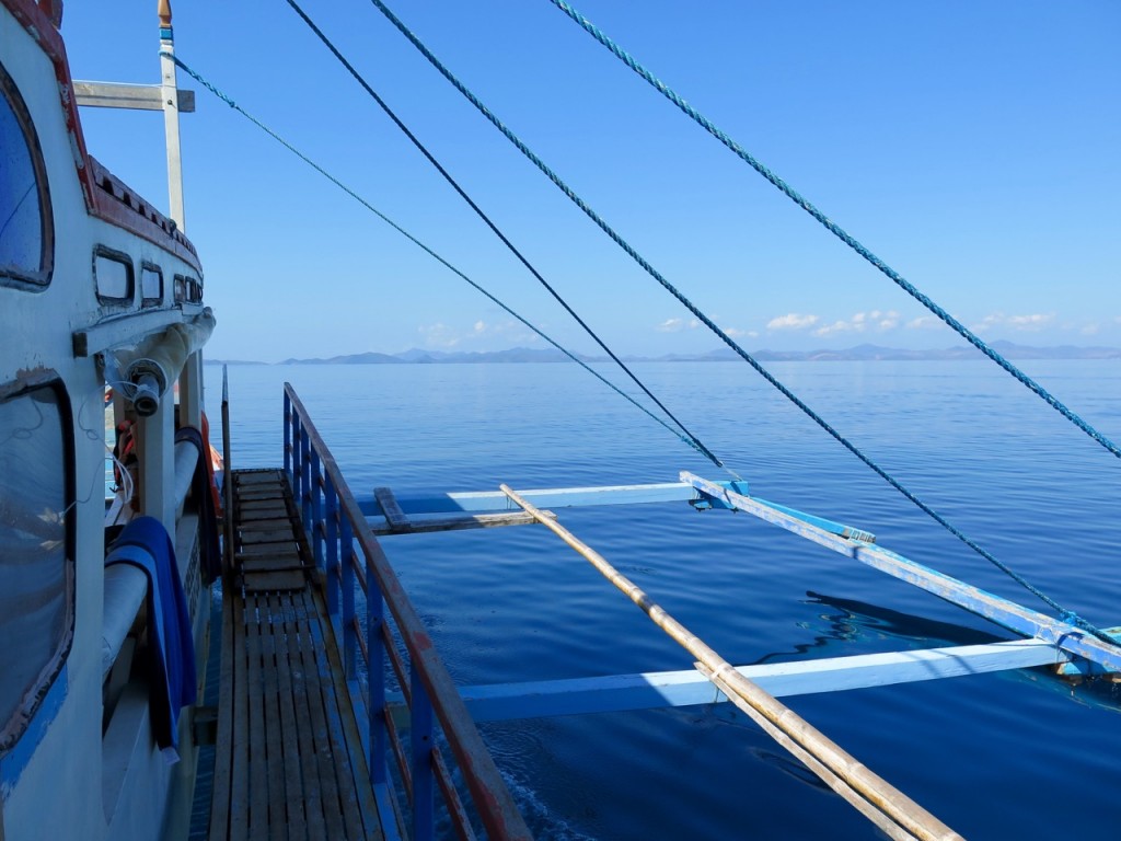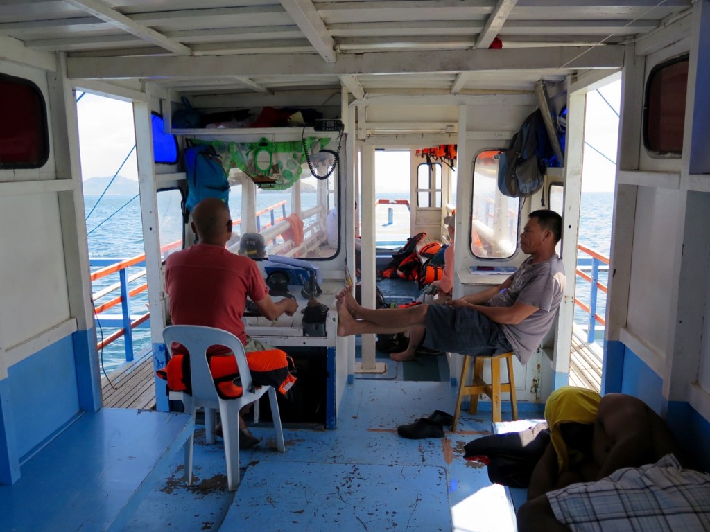 Le coût de la traversée est de 1 800 php par personne (repas compris) ; la durée est de 7 à 8 heures selon les conditions de mer. Nous sommes à peine 5 ou 6, plus trois membres d’équipage.