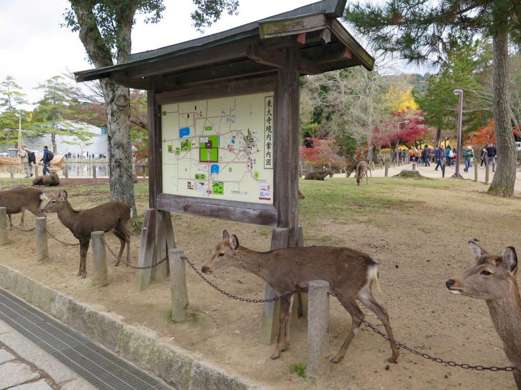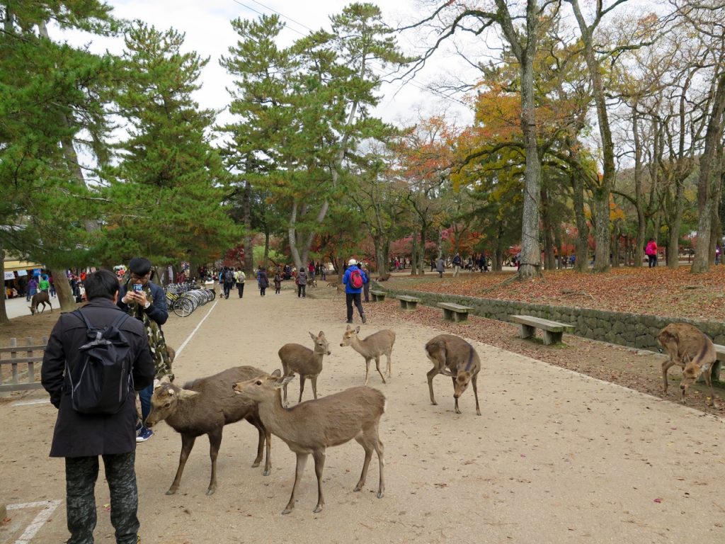 Nous nous dirigeons maintenant vers la « star » des lieux, j’ai nommé le Todai-ji. Sur le chemin, nous retrouvons les cerfs, qui attendent la bouffe…