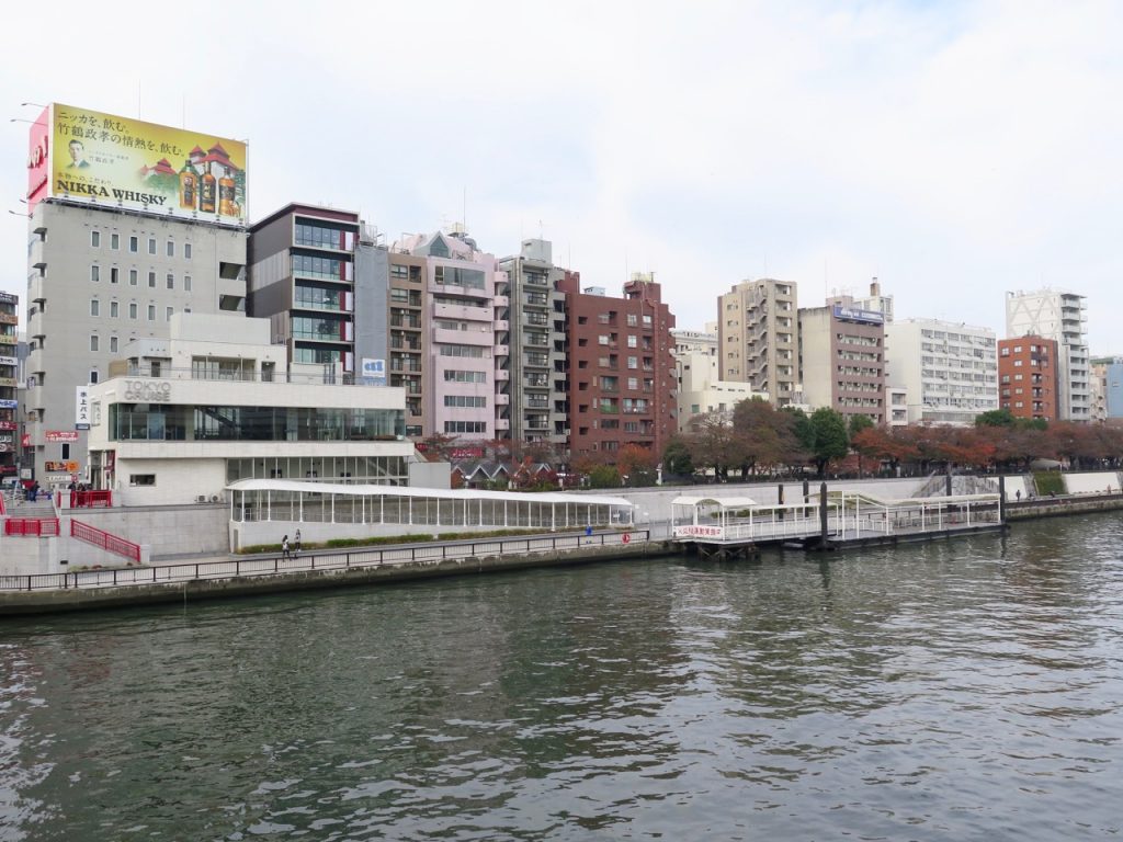 Nous traversons le pont qui enjambe la rivière Sumida. Il fait doux et le soleil tente quelques percées.