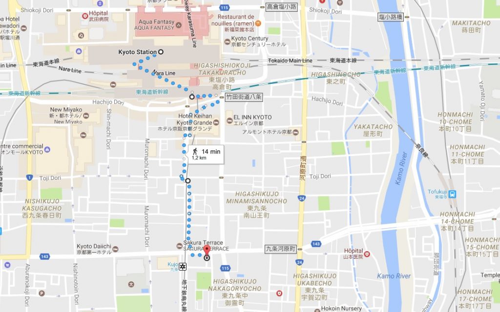 Nous arrivons à Kyoto vers 18 h. Maintenant, le plus difficile commence : trouver notre appartement Airbnb ! Voici son emplacement approximatif. Il est idéalement placé, à 10 minutes de la gare.