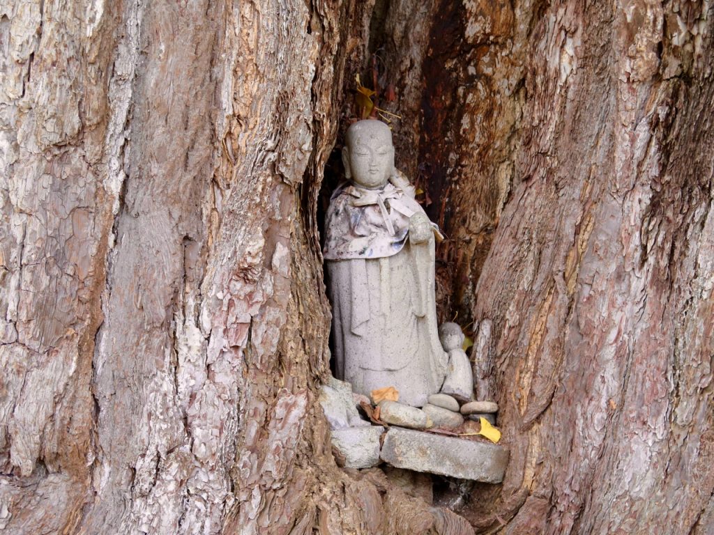L’arbre majestueux que l’on voit juste à côté, un gingko, aurait plus de 1 200 ans ! Il fait 28 m de haut et 10 m de circonférence.