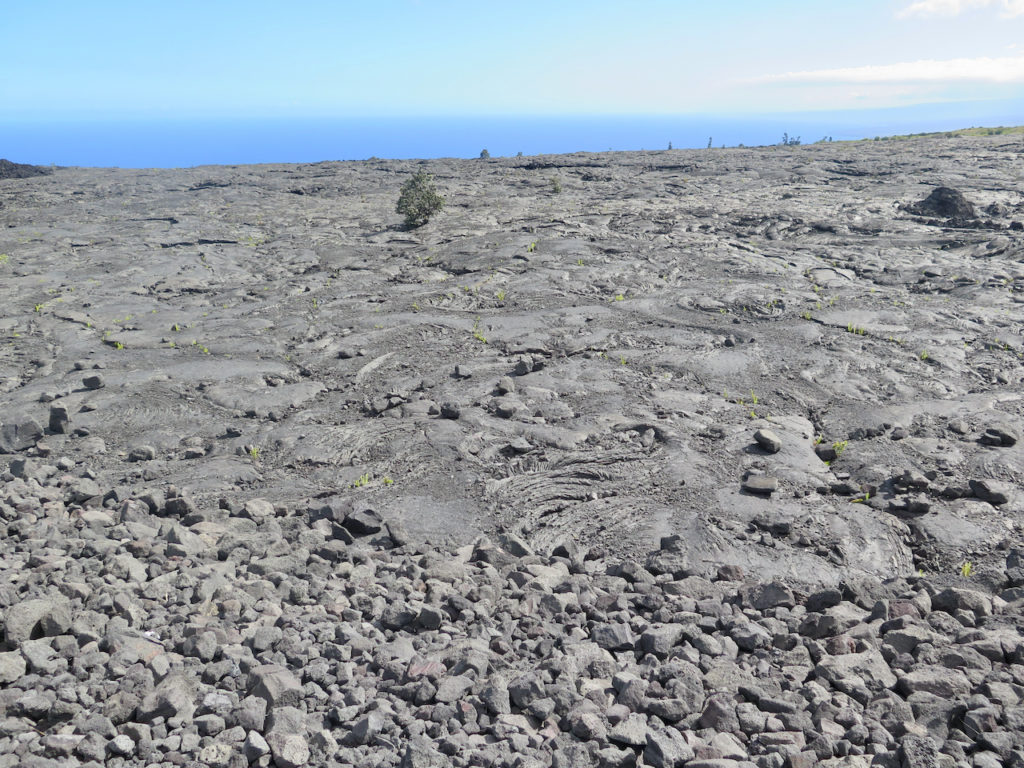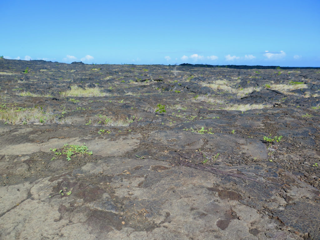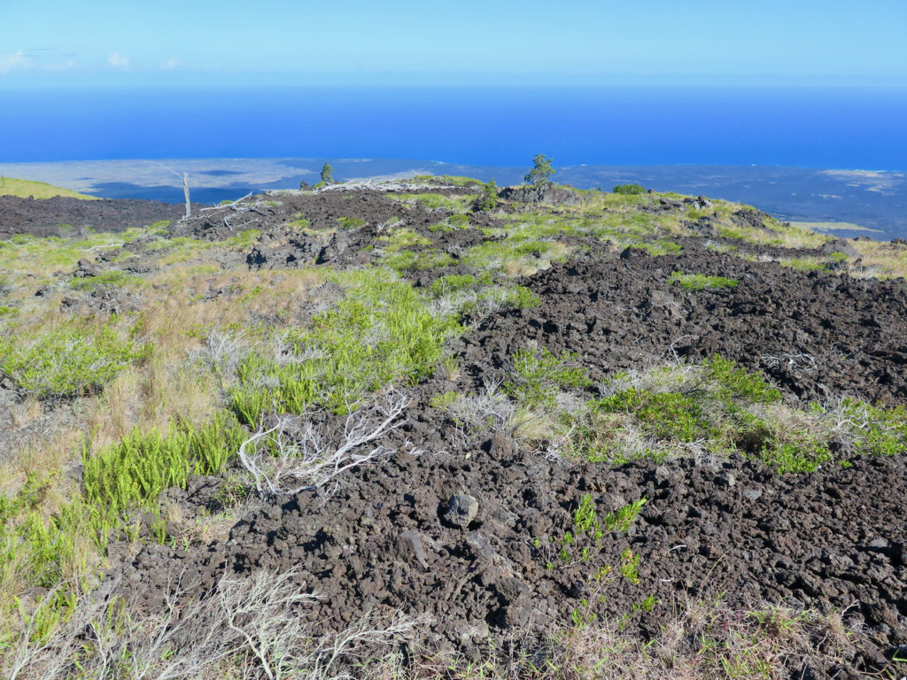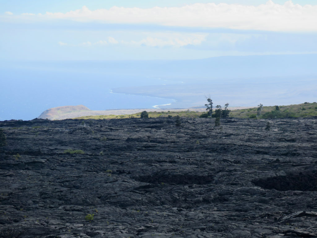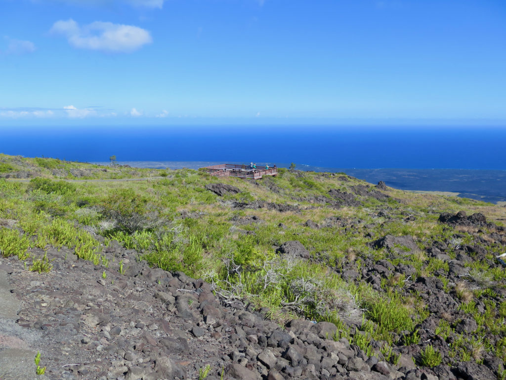 Au premier plan, de la lave durcie par le temps, avec une végétation qui reprendre (très) doucement ses droits ; au milieu, la route que nous empruntons et qui nous mènera jusqu’à la côte ; au fond, le bleu profond de l’océan Pacifique.