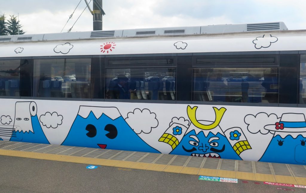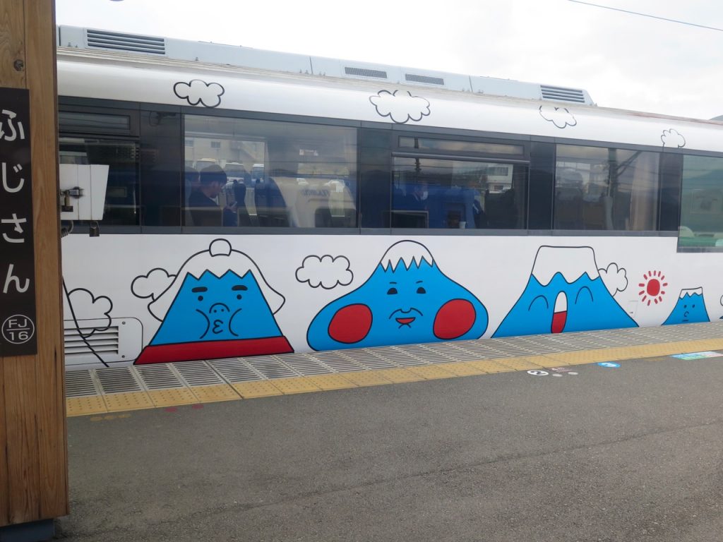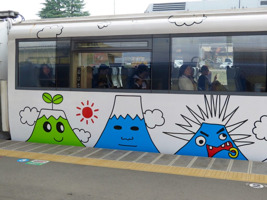 Une heure plus tard, nous arrivons à Otsuki ; de là, nous devons prendre un autre train, cette fois de la ligne privée Fujikyu. Leurs trains sont d’ailleurs assez originaux.