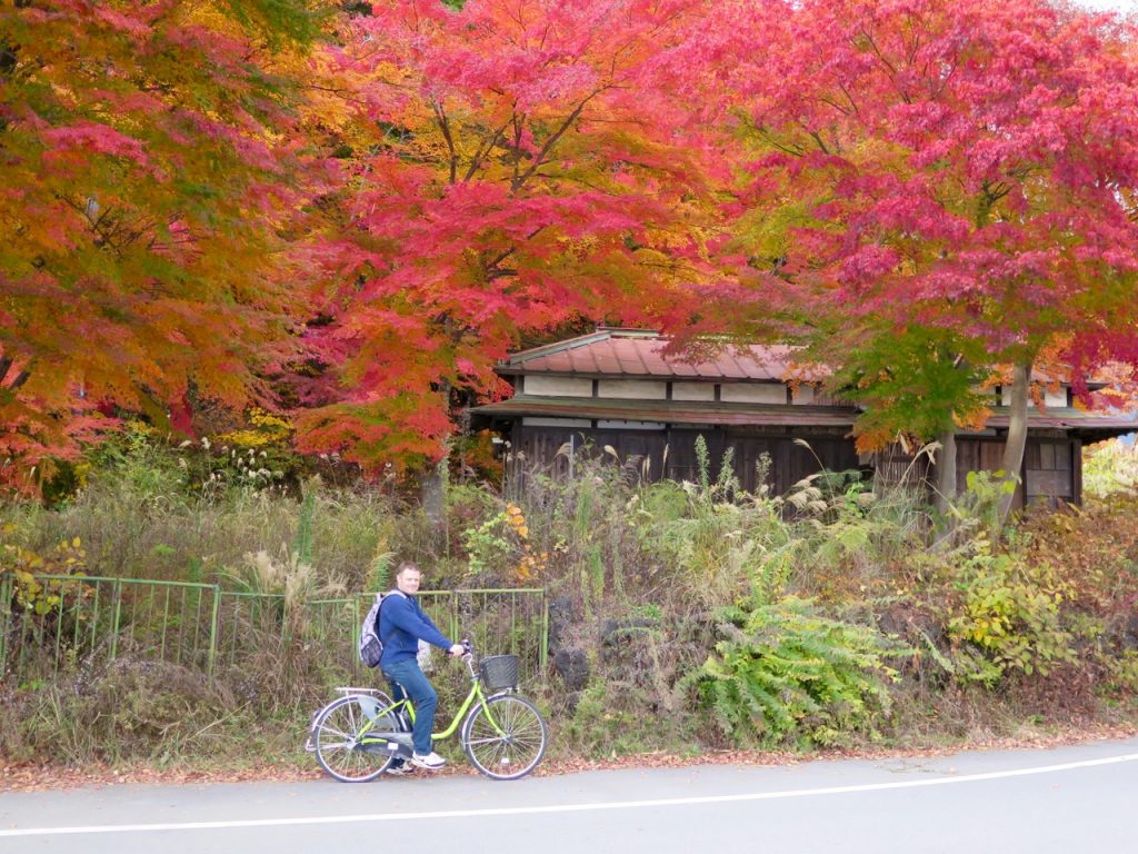Nous débutons notre tour du lac – qui fait environ 20 km – en circulant… à gauche de la route ! Eh oui, au Japon, on roule à gauche. Bon, c’est un coup à prendre et ça se fait bien. Le plus difficile, au début, est de bien négocier les croisements puisque tout est inversé par rapport à nos critères. En tout cas, le vélo électrique, on est fans ! 😉