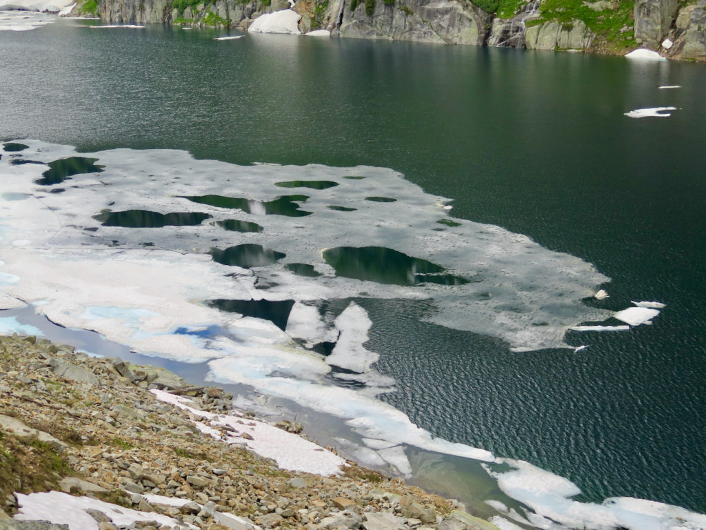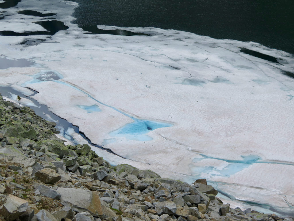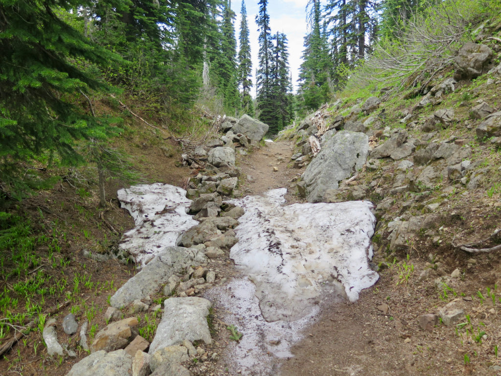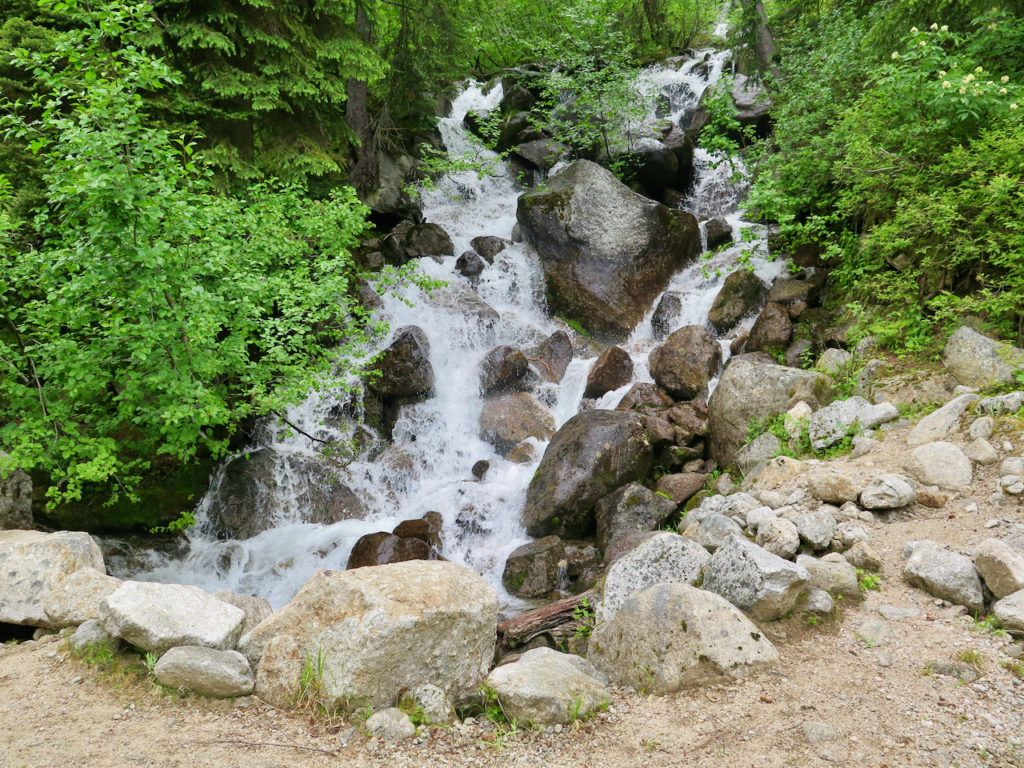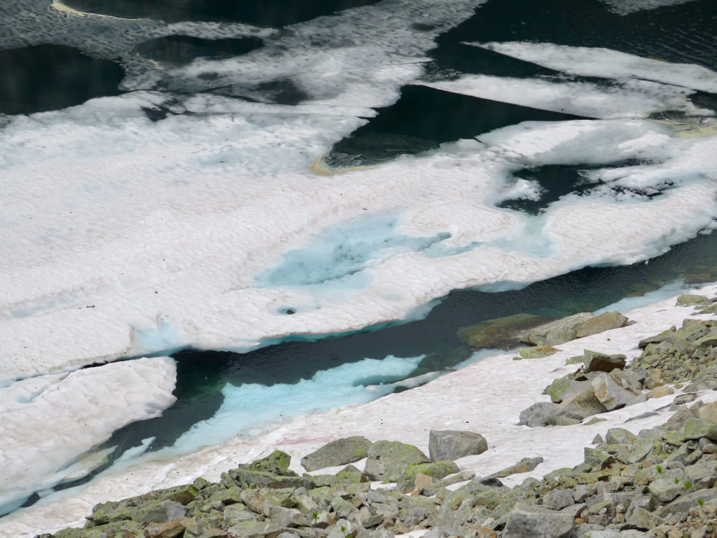 Ici, nous sommes dans le secteur des pikas, ces petits mammifères ressemblant à de petits lapins. On les a souvent entendus, parfois aperçus, mais impossible d’en prendre un en photo ! Ils se cachent sous les rochers et sont rapides comme l’éclair ! Premières traces de neige également ; pas mal un 16 juillet à environ 1 900 m d’altitude.