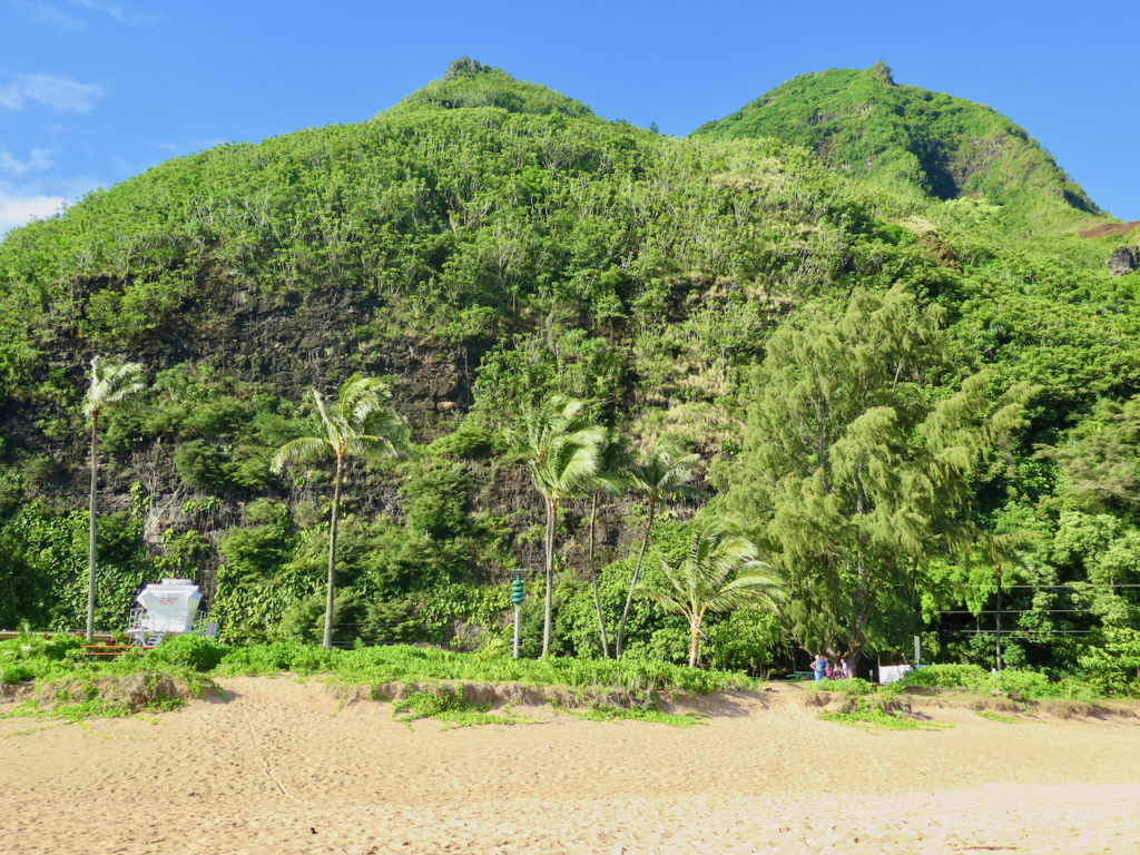 Ce matin, il fait très beau, mais le temps change très vite dans cette partie de l’île. Les montagnes situées derrière la plage, très arrosées en toute saison, sont verdoyantes.