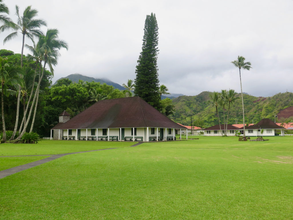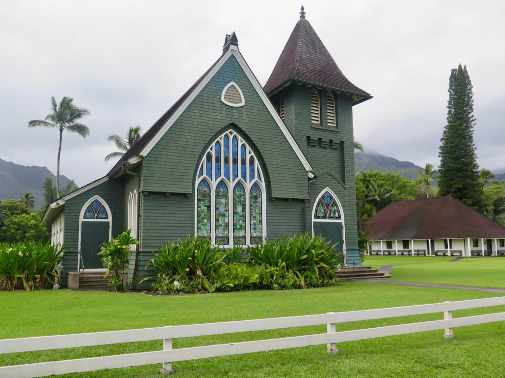 La superbe église de Hanalei, typiquement polynésienne, et l’école du village.