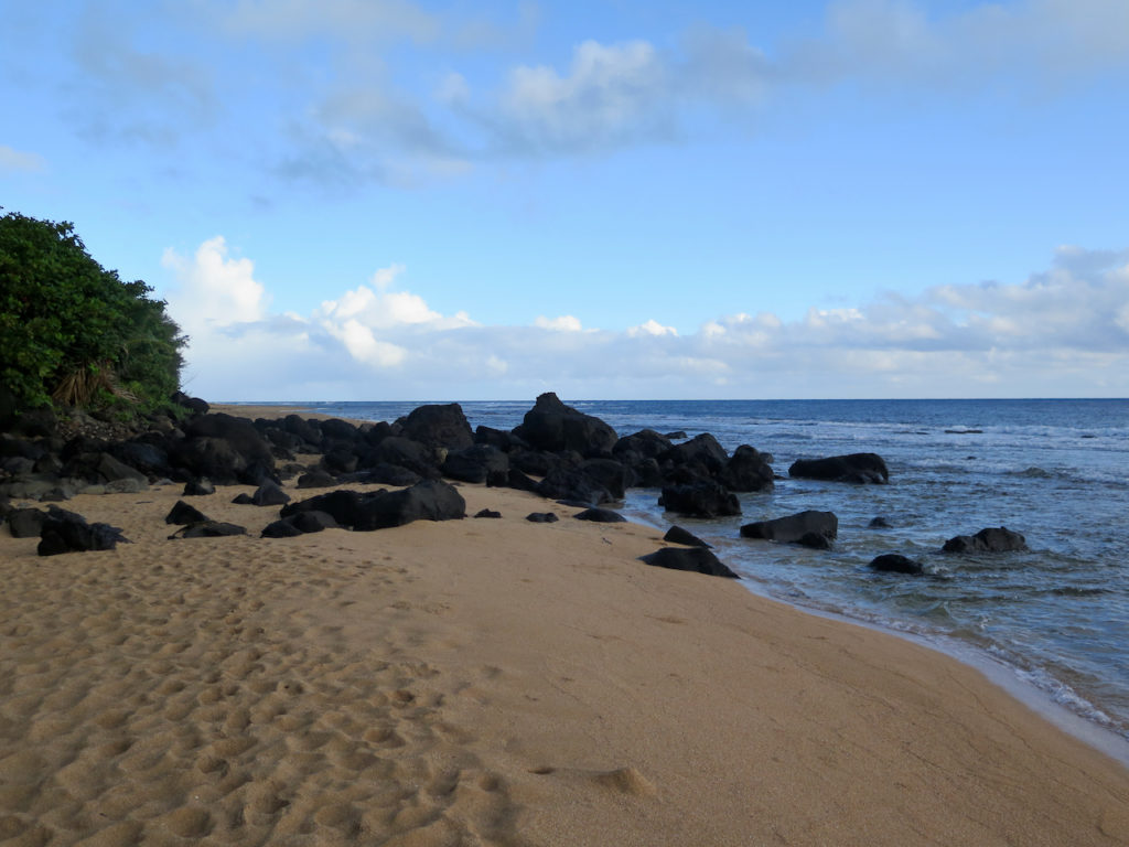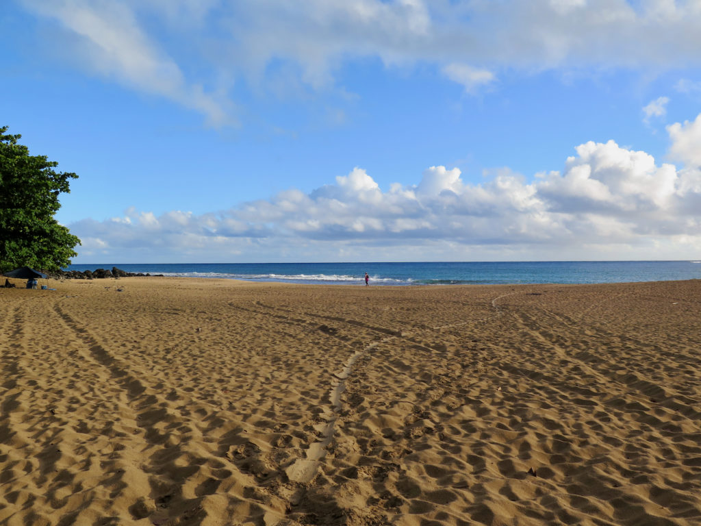 En ce 21 juillet, comme prévu, nous nous garons au parking situé à côté de Haena Beach, vers 7 h du matin. Il n’y a quasiment personne.