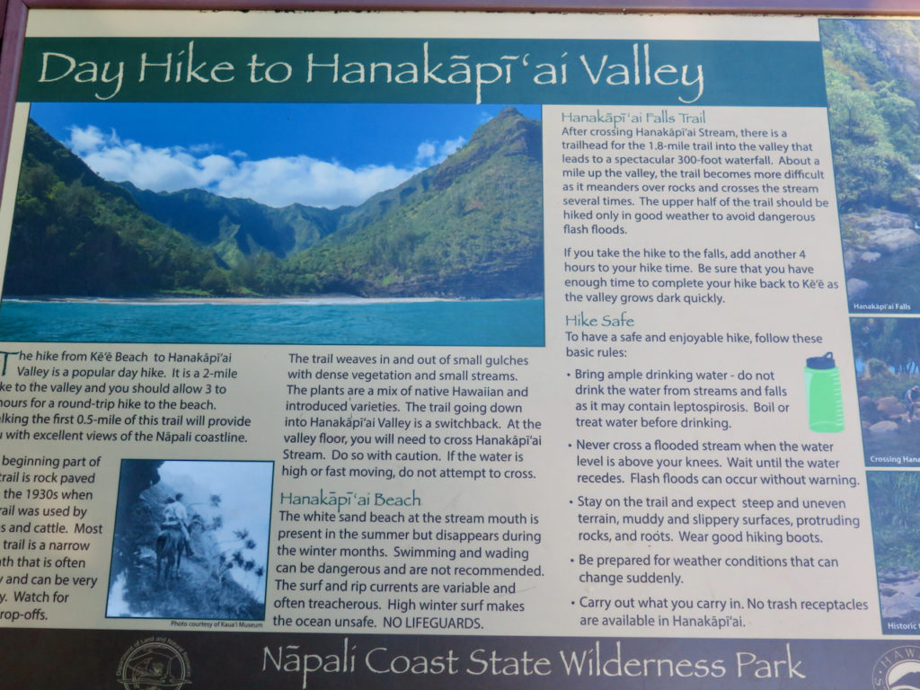 Nous ne partons que pour la journée ; nous irons donc seulement jusqu’à Hanakāpī’ai Beach (2 miles), puis jusqu’aux Hanakāpī’ai Falls, 2 miles de plus vers le nord (voir la carte ci-dessus). Tout cela aller-retour, plus les 4 km (aller-retour) pour rejoindre le parking. Cela fait environ 17 km.