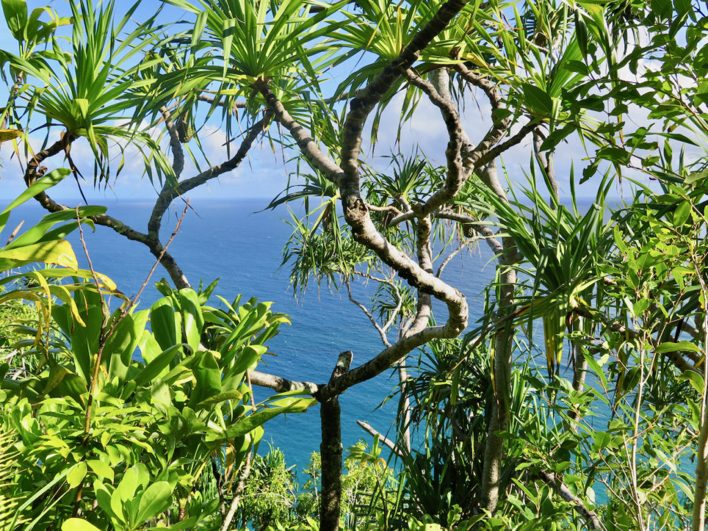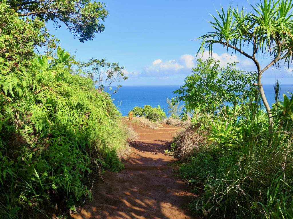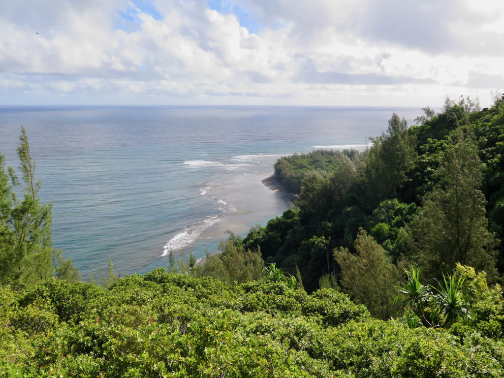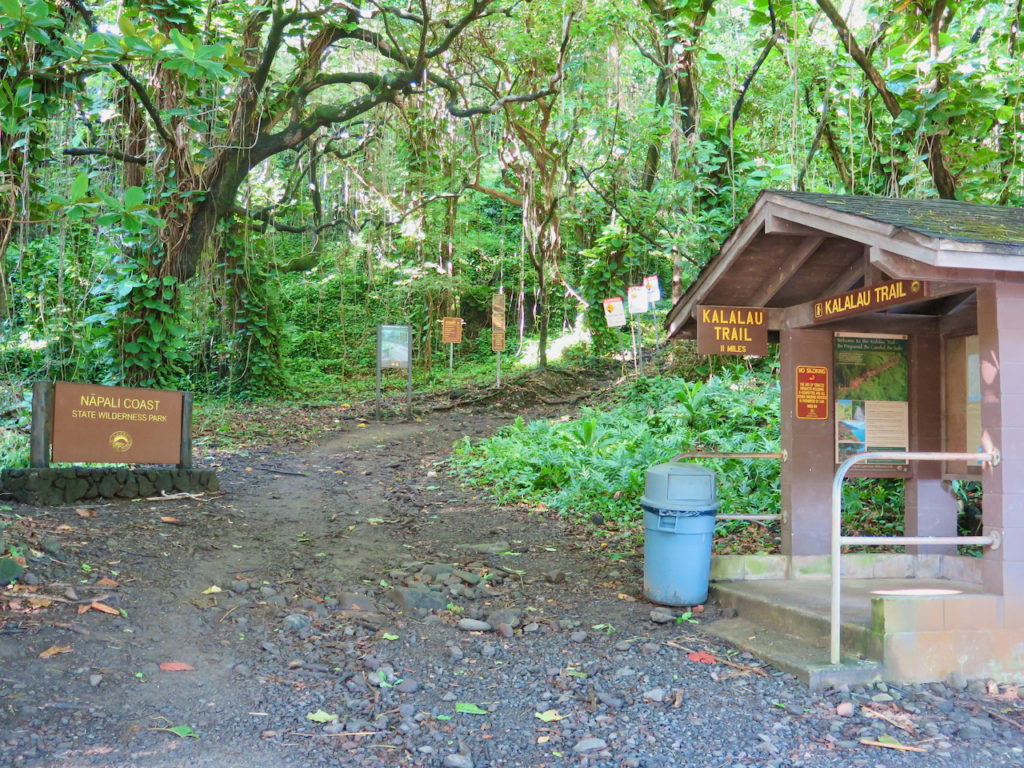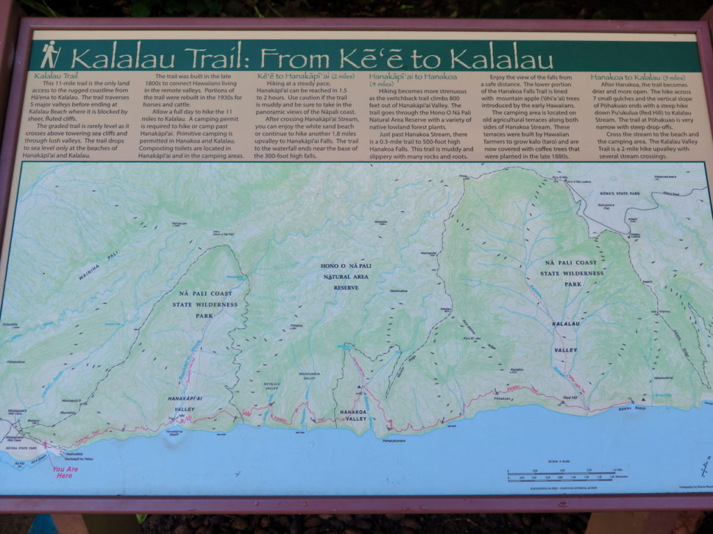 Malheureusement, nous n’avons pas pu faire le sentier en entier. Pourquoi ? Eh bien, lors de l’organisation du voyage, j’ai manqué mon coup lorsque j’ai voulu réserver les différents permis requis pour y accéder : c’était déjà plein ! Et pourtant, j’étais aux aguets. Les autorités ont rendu les choses très difficiles : impossibilité de se garer de nuit sur le nouveau parking ; réservation obligatoire (et places limitées) pour s’y garer de jour ; navette [de Princeville au parc] aux horaires contraignants ; nombre de permis quotidiens limité. Lorsque vous souhaitez faire la randonnée en intégralité, qui prend 3 jours et 2 nuits au bas mot, l’organisation devient vite très compliquée…