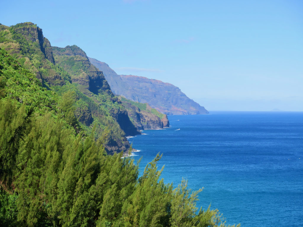 Nous partons peu avant 7 h 30 et décidons de longer la côte pour atteindre le départ du Kalalau Trail. On a de la chance, il fait très beau ; mais le temps change très vite par ici…