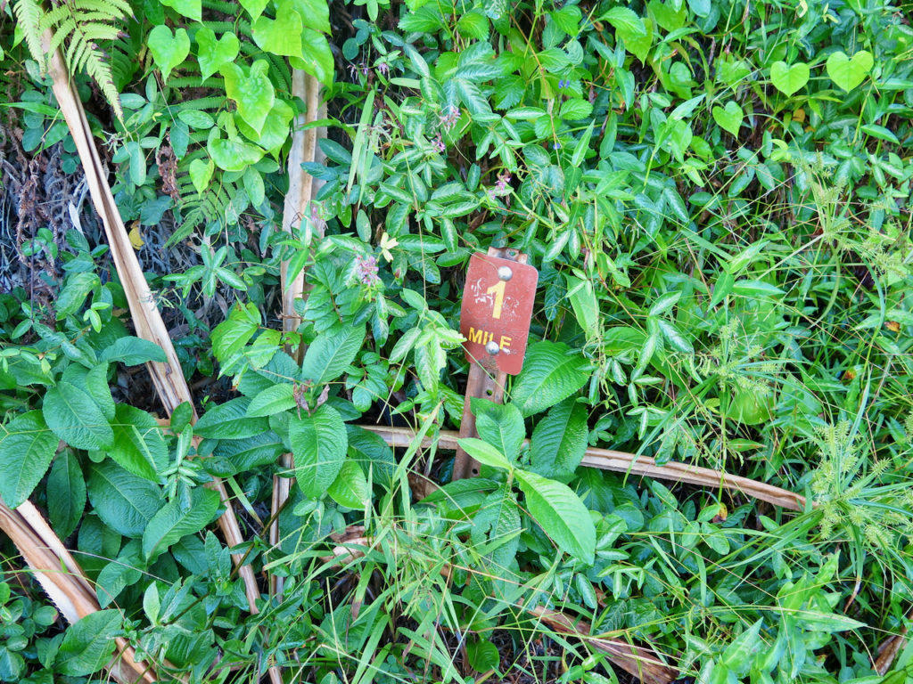 Il est 10 h 45. Notre pause terminée, nous reprenons notre route. Le sentier remonte dans les terres, puis nous arrivons à cet embranchement. À droite, c’est le Kalalau Trail [à partir de là, il faut obligatoirement un permis pour camper] ; tout droit, c’est le sentier qui va aux Hanakāpī’ai Falls.