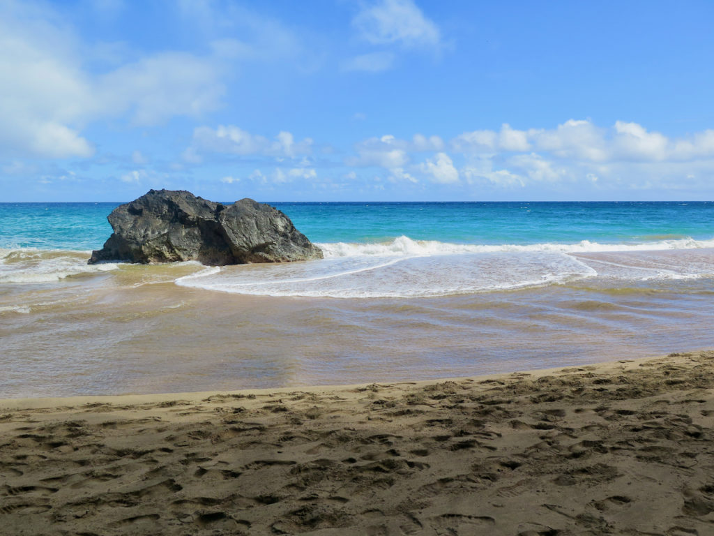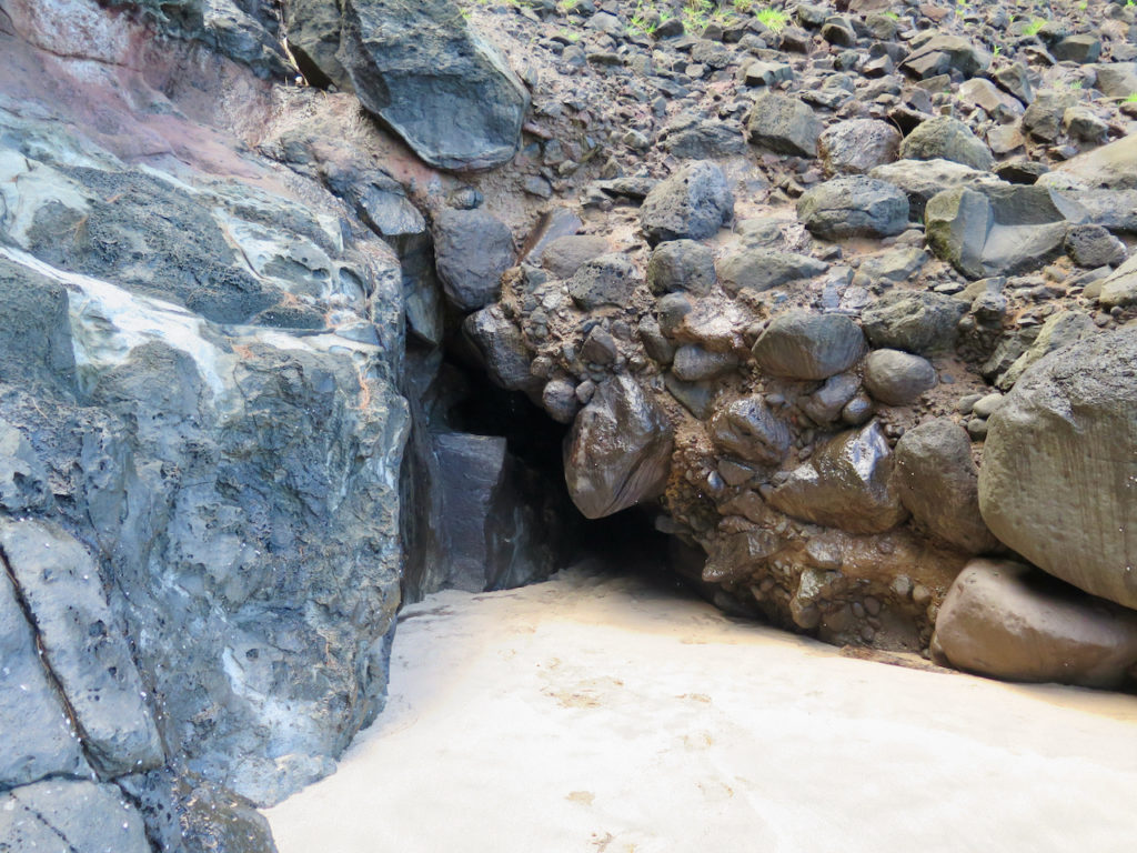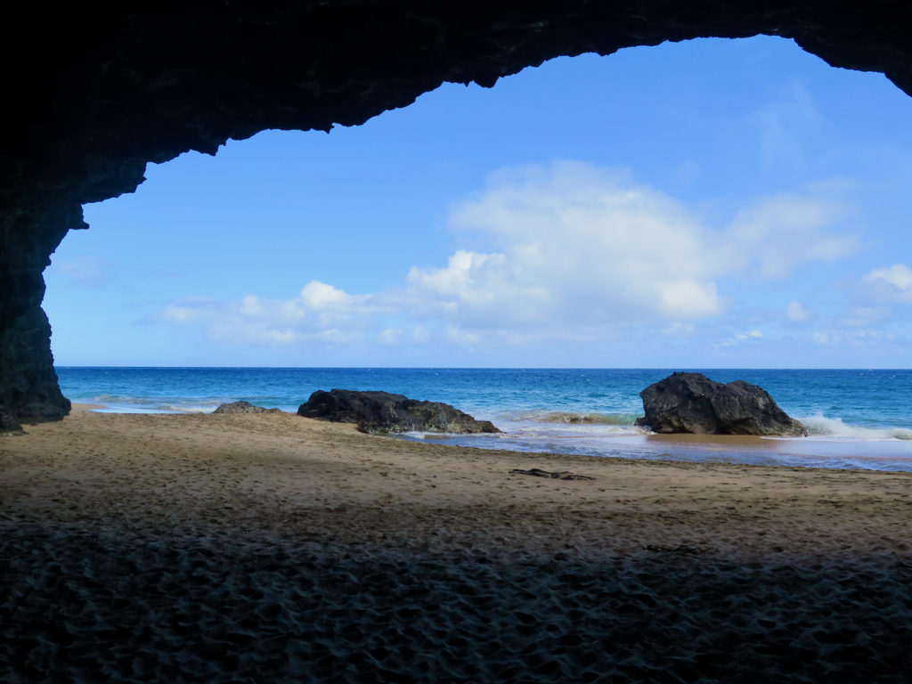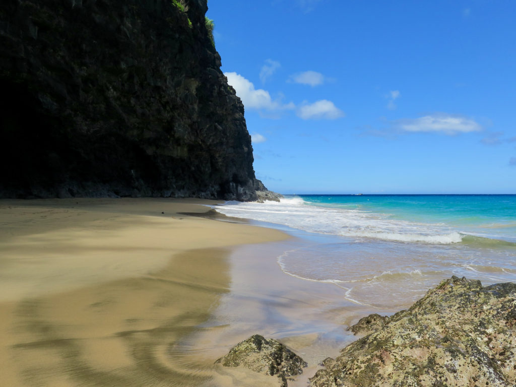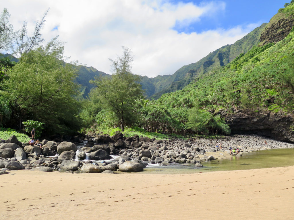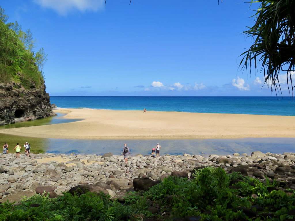 Après une heure et demie de marche tranquille, nous arrivons à Hanakāpī’ai Beach à 9 h 45. Les deux premiers miles (3,2 km) sont faits, auxquels il faut ajouter un peu plus de 2 km pour la partie précédant le Kalalau Trail en lui-même.