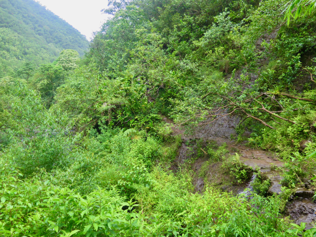La première partie du retour, jusqu’à Hanakāpī’ai Beach, se fait sous la pluie, et même des trombes d’eau peu avant l’embranchement. Nous avions rarement vu de la pluie tomber aussi fort [en Malaisie, peut-être]. On aurait pu sortir le Tahiti Douche ! Heureusement, on avait prévu les sacs étanches pour mettre appareil photo et autres objets « sensibles » en sécurité.