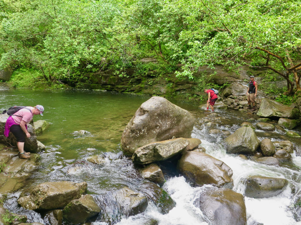 Première rivière que nous devons traverser. Cela permet de laver les chaussures, très temporairement cependant. Pas de difficulté majeure aujourd’hui, mais il convient d’être prudent. Cela étant, le franchissement peut vite devenir impossible en cas de fortes pluies (ce qui arrive souvent).