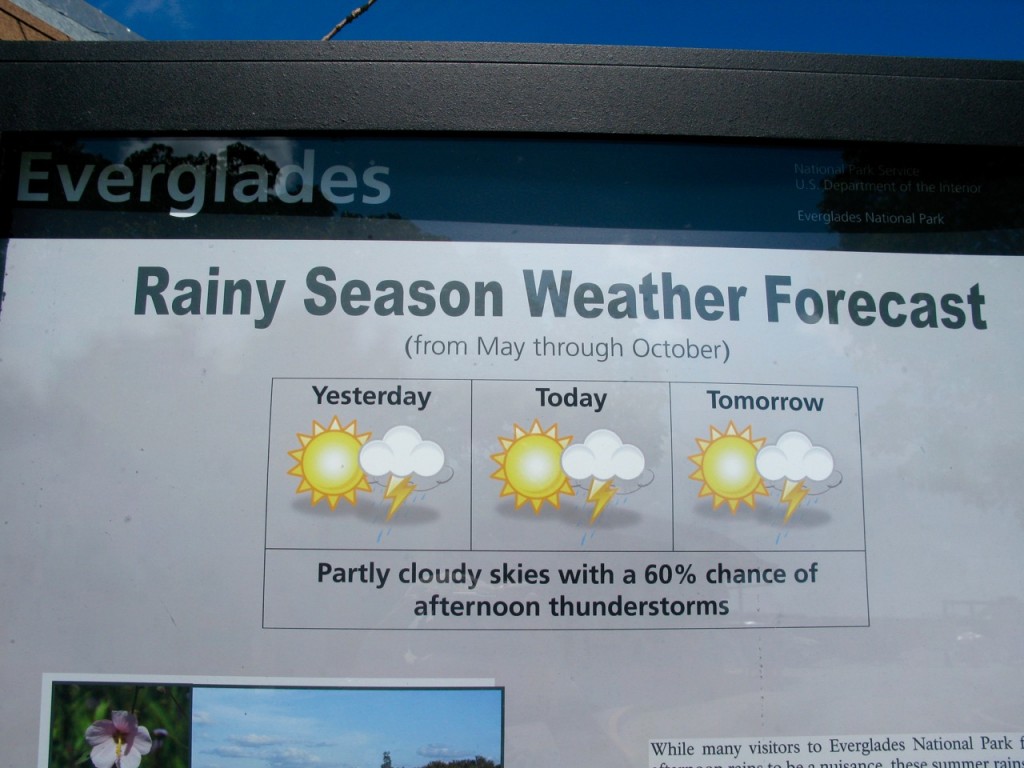 En été, les prévisions météo sont très simples ici : soleil quasiment tous les jours et températures identiques (24/32 °C environ), ne baissant que très légèrement au gré des (rares) averses, parfois orageuses, qui viennent rehausser un taux d’humidité toujours plus haut… J’ai donc bien aimé cette pancarte ! 😉
