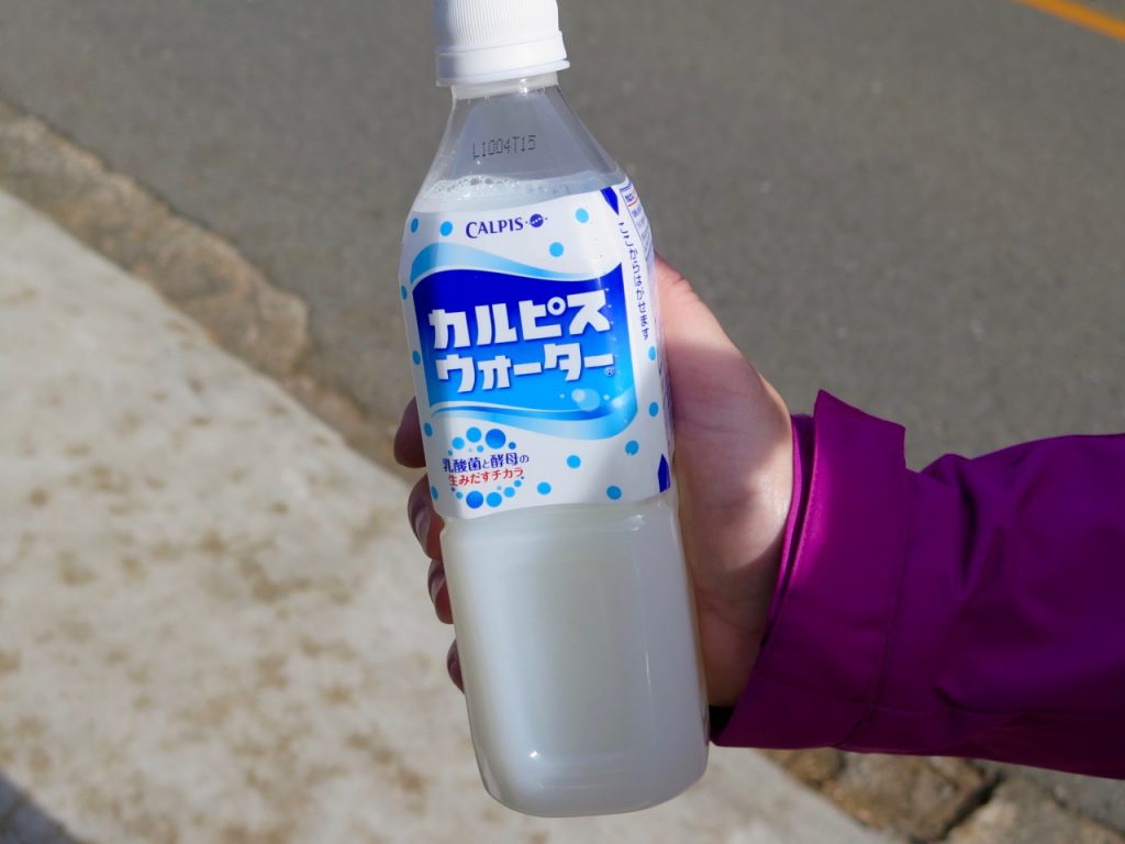 Nous sommes de retour au village, près de l’arrêt de bus. C’est déjà l’heure de manger et, cette fois, nous avons emporté des sandwiches ! La petite pause près de la rivière, au soleil, est bien agréable. Par ailleurs, nous faisons une découverte rafraîchissante : le Calpis. Une excellente boisson japonaise !